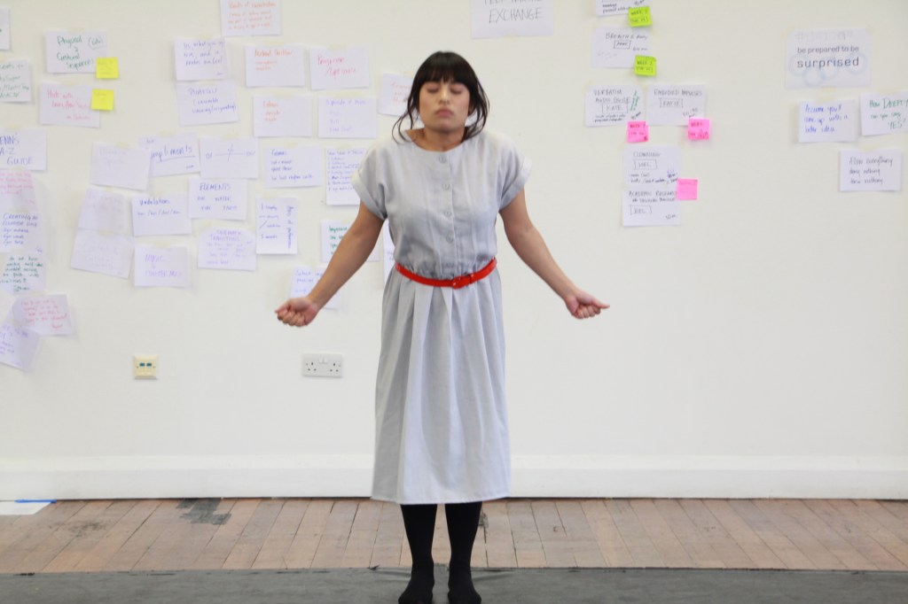 By the end of the first week, my head was spinning between awe and discovery to cycles of overly self-critical voices. On my day off I chose not to think about it at all, not beat myself up about it, and do some stuff for ME, guilt-free. The other thing I’ve learned is that I need to give my head some peace sometimes. The depths of my mind can be a busy, noisy place, so it’s in this breathing space I can organise my thoughts for a bit of clarity. By Monday morning I was back in the room, present, ready…and with ideas I hadn’t tried to squeeeeze out under my own self-inflicted pressure. As we move through the final week of the intensive, aware of what my blocks are, I’m ready to accept and absorb what’s on offer.