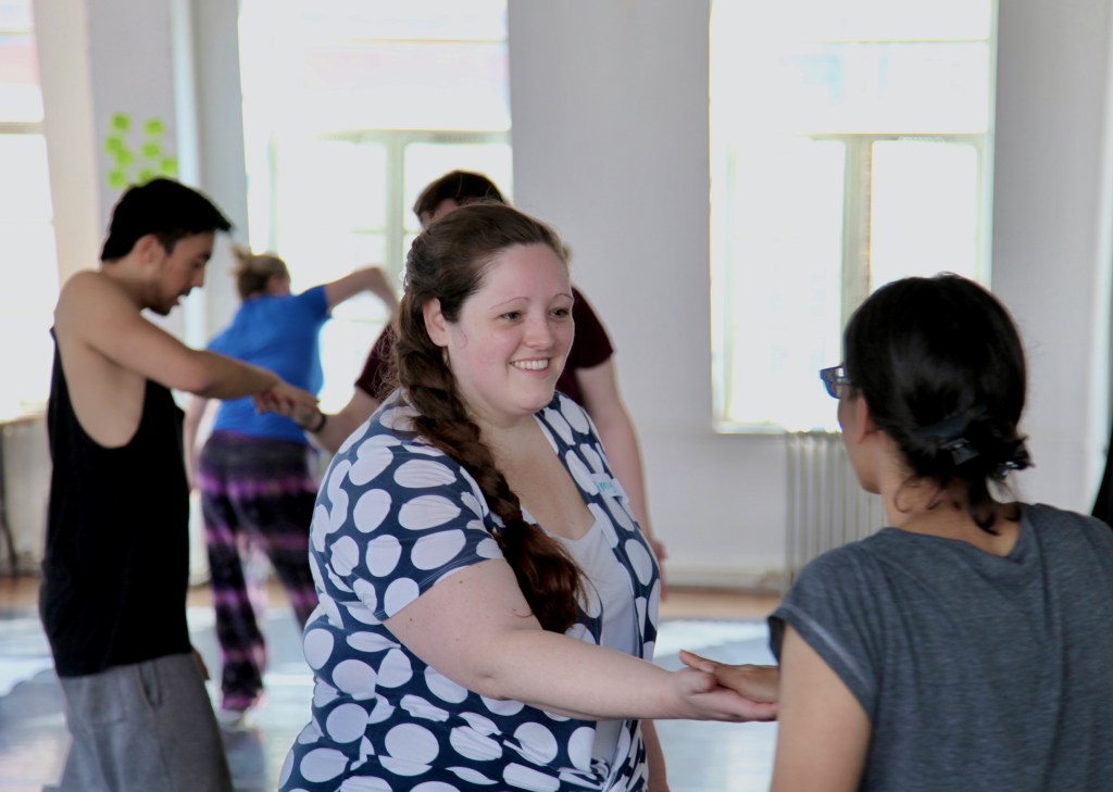 IMAGE: Amy Clare Tasker and Naomi Joseph participate in a physical theatre exercise led by Tashi Baiguerra.